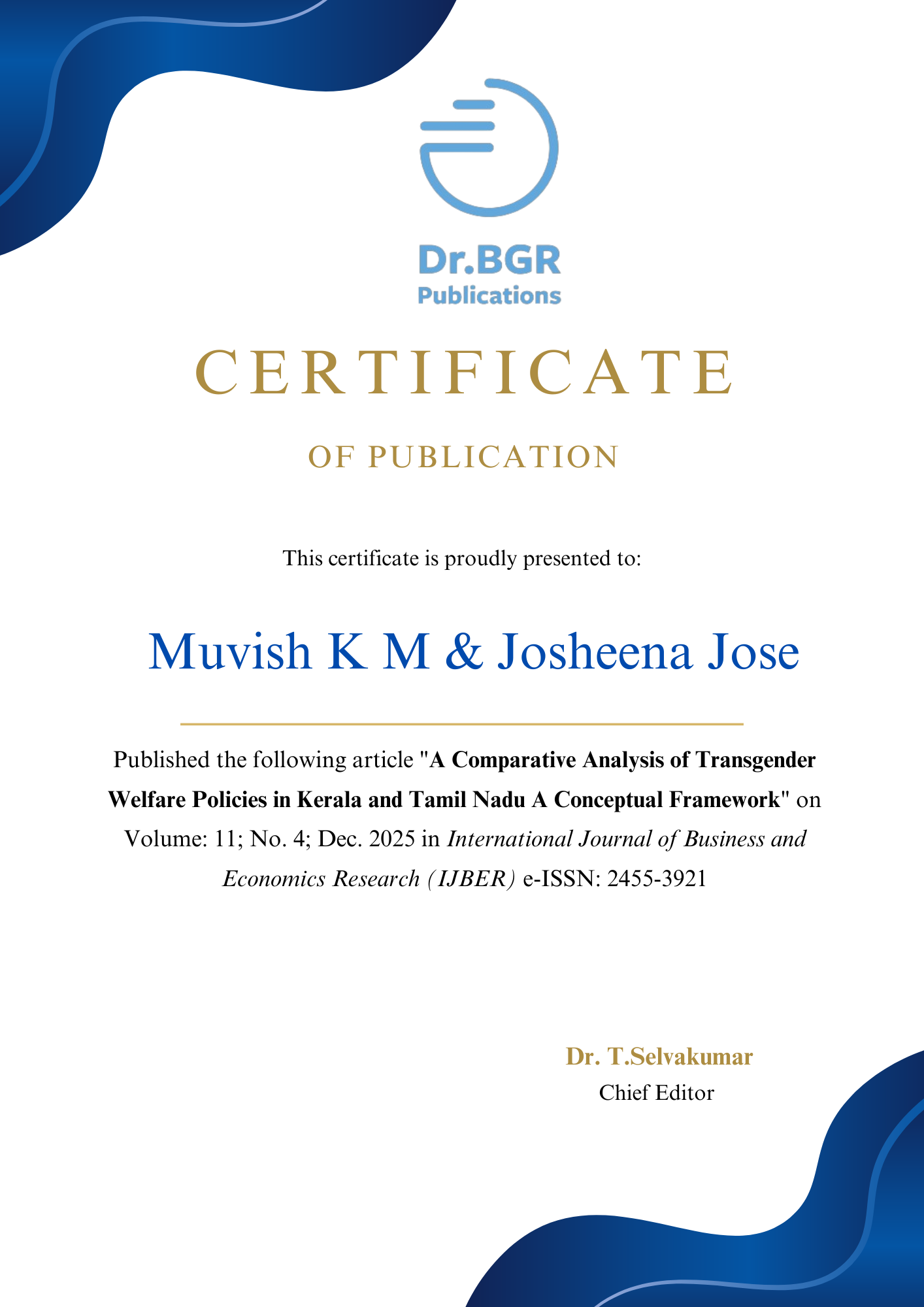 Muvish K M and Josheena Jose, A Comparative Analysis of Transgender Welfare Policies in Kerala and Tamil Nadu A Conceptual Framework, International Journal of Business and Economics Research (IJBER) e-ISSN: 2455-3921; 11.4 (2025): 77 – 81