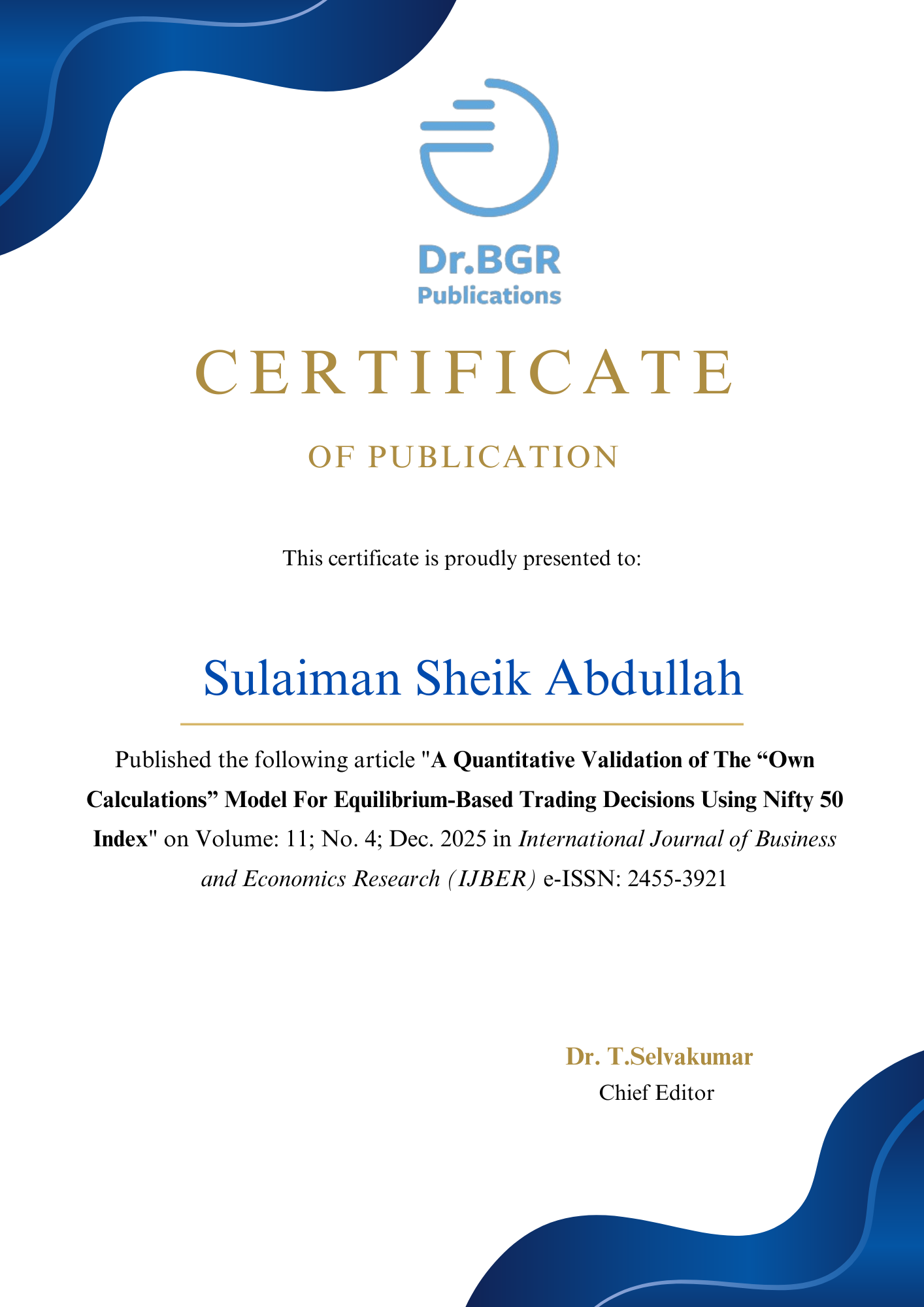 The study presents a novel, data-driven trading framework termed the “Own Calculations” model, developed to forecast equilibrium values in the Nifty 50 Index before market opening and validated through empirical and statistical testing. The model operates on the principles of mean reversion and statistical agreement, using daily Open, High, Low, and Close (OHLC) data to identify deviation-based trading opportunities. Data were collected for twenty-two trading sessions between 22 September and 23 October 2025, and analyzed using the Bland–Altman test, Correlation, and Regression analysis to assess accuracy and predictive strength. The findings reveal a strong positive correlation (r = 0.978, p < 0.01) and an R² value of 0.957, indicating that the model’s derived equilibrium values explain over 95% of the variation in actual market averages. The Bland–Altman test further confirmed consistency, showing a mean bias of −31.85 and limits of agreement within acceptable statistical boundaries (−194.15 to +130.46). These results validate that the “Own Calculations” framework effectively mirrors real market behaviour, enabling traders to identify overbought and oversold zones based on significant deviations. From a strategic perspective, the study highlights that applying a deviation threshold of ±80 points improves trade accuracy by filtering market noise and reducing overtrading. When integrated with option strategies particularly In-the-Money (ITM) options and Breakeven (BEP) levels the model enhances decision-making consistency and capital efficiency. The research contributes to quantitative finance by offering a statistically validated, practically applicable trading system that bridges analytical modelling and real-world execution by the researcher.
