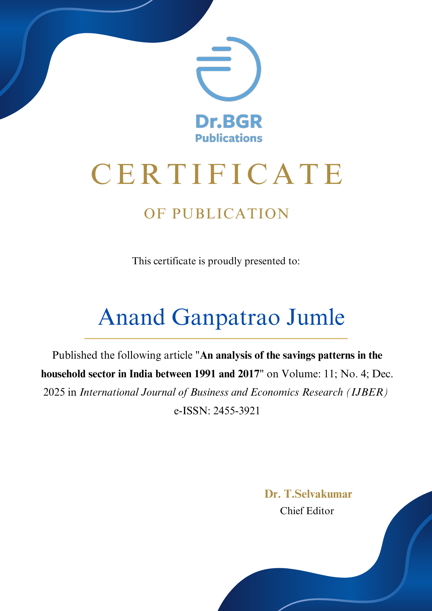 Anand Ganpatrao Jumle, An analysis of the savings patterns in the household sector in India between 1991 and 2017, International Journal of Business and Economics Research (IJBER) e-ISSN: 2455-3921; 11.4 (2025): 37 – 47