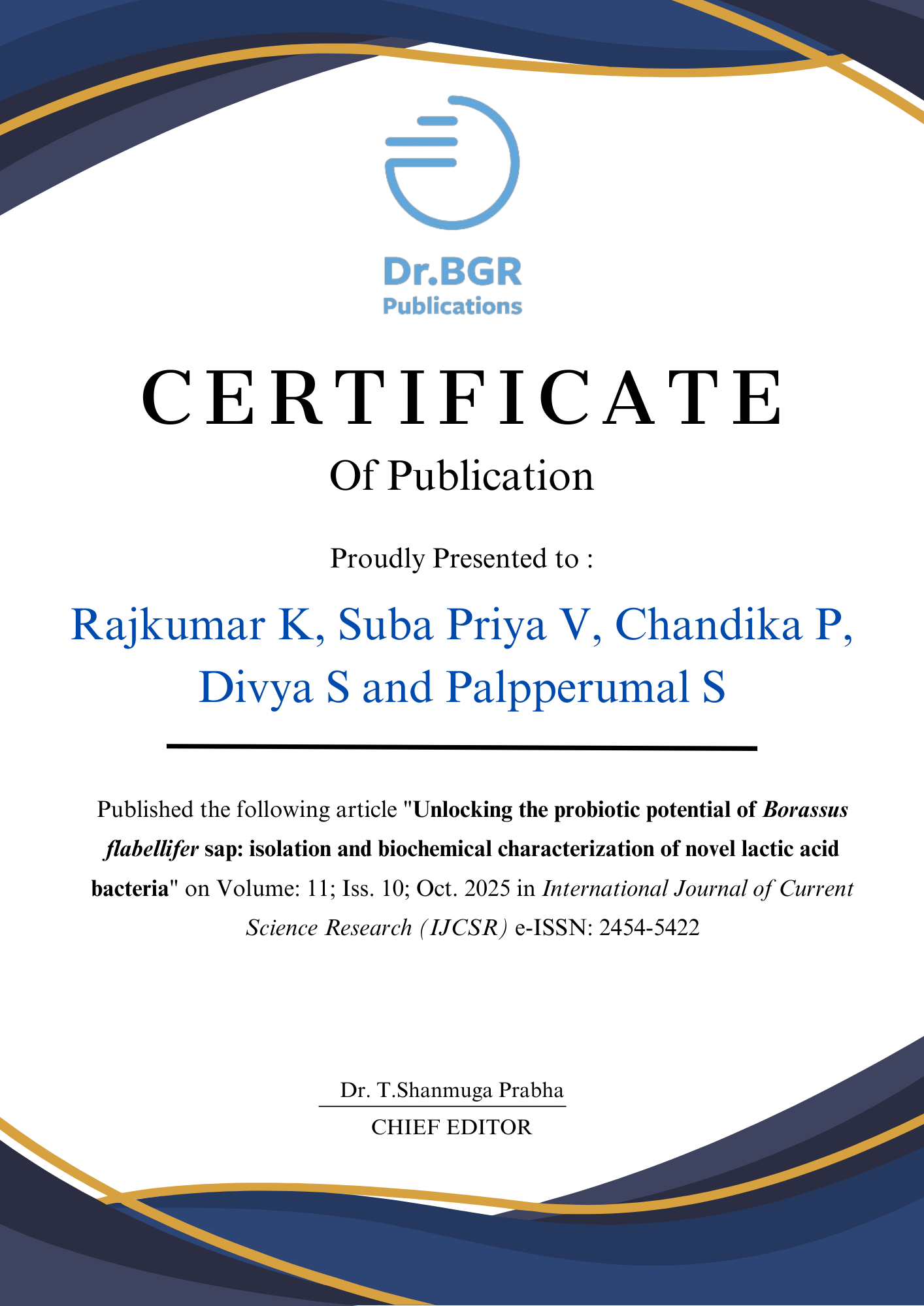 Lactobacillus species are the bacteria that were isolated and identified from the sap of Borassus flabellifer. These species produce lactic acid. In addition to its important role in diabetes control, the probiotic microbiota has other advantageous properties including antibacterial and antibiotic agents and is essential for gastrointestinal health. Various laboratory procedures were used to identify and isolate lactic acid bacteria (LAB).The growth morphology on the selected media, growth at a different temperature, and other biochemical tests were used to identify them. Sugar from Borassus flabellifer was gathered at random from nearby markets for bacteriological analysis. Fresh Palmyra palm sugar samples were collected and cultured on de Man, Rogosa, and Sharpe (MRS) agar to isolate Lactobacillus species. The current study determines Lactobacillus species probiotic capacity. Various laboratory procedures were used to identify and isolate LAB. The growth morphology on the selected media, growth at a different temperature, and other biochemical tests were used to identify them. The purpose of this study was to isolate and characterize LAB with probiotic properties from Palmyra palm sugar.