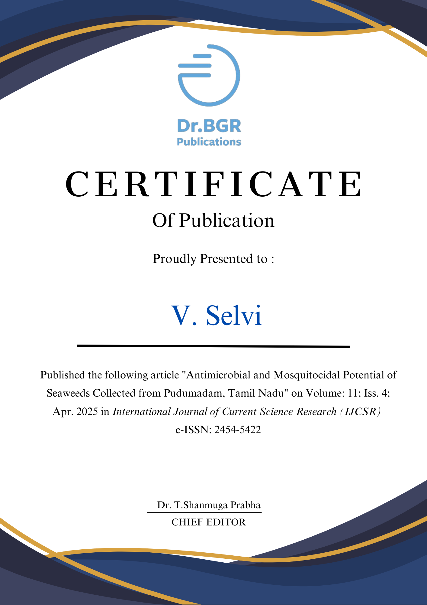 The seaweeds (Sargassum wightii, Sargassum muticum, Ulva lactuca and Ulva fasciata) were screened against potential harmful pathogens such as Staphylococcus aureus, Escherichia coli, Bacillus subtilus, Pseudomonas aeruginosa and Klebsiella pneumonia. Chloroform, methanol, ethanol, acetone and butanol are the solvents used to extract the seaweeds. Eight different phytochemical compounds were present in the seaweeds. The prominent activity was observed Sargassum wightii (22 mm) followed by Ulva fasciata (18 mm), Ulva lactuca (15 mm) and Sargassum muticum (10 mm). The compound were subjected to evaluate their larvicidal potential against Aedes aegypti and Anopheles.